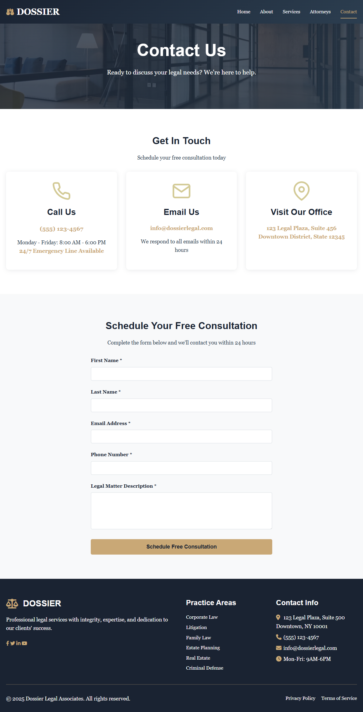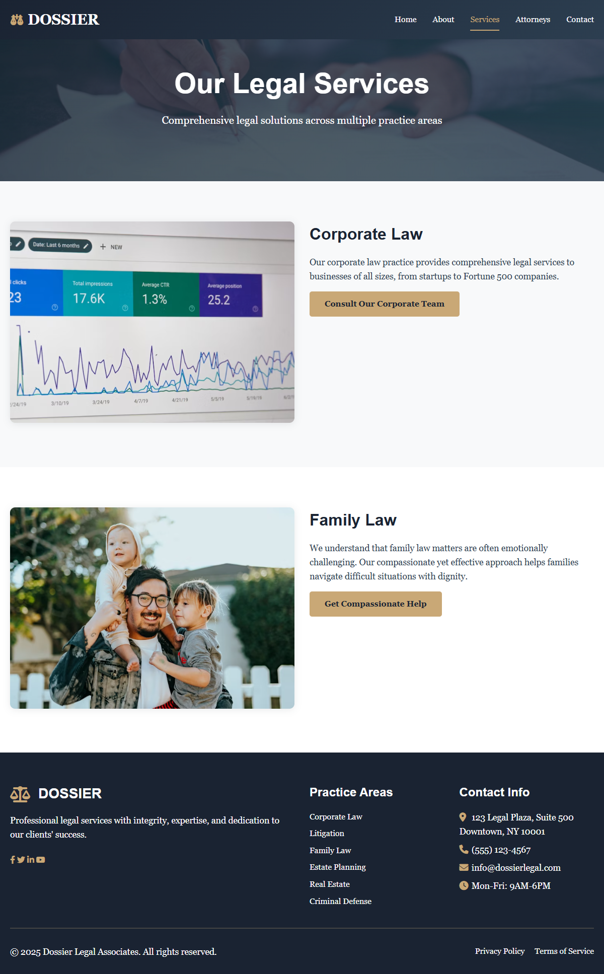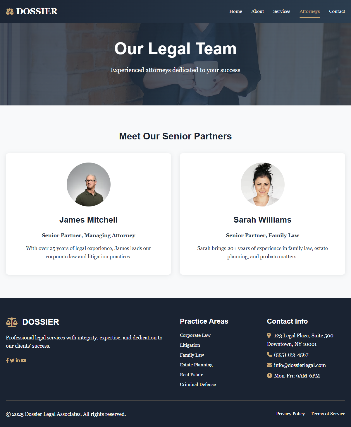 - 5 Complete Sections - Home, About, Services, Attorneys, Contact with seamless navigation