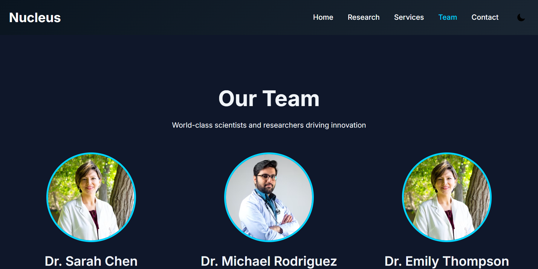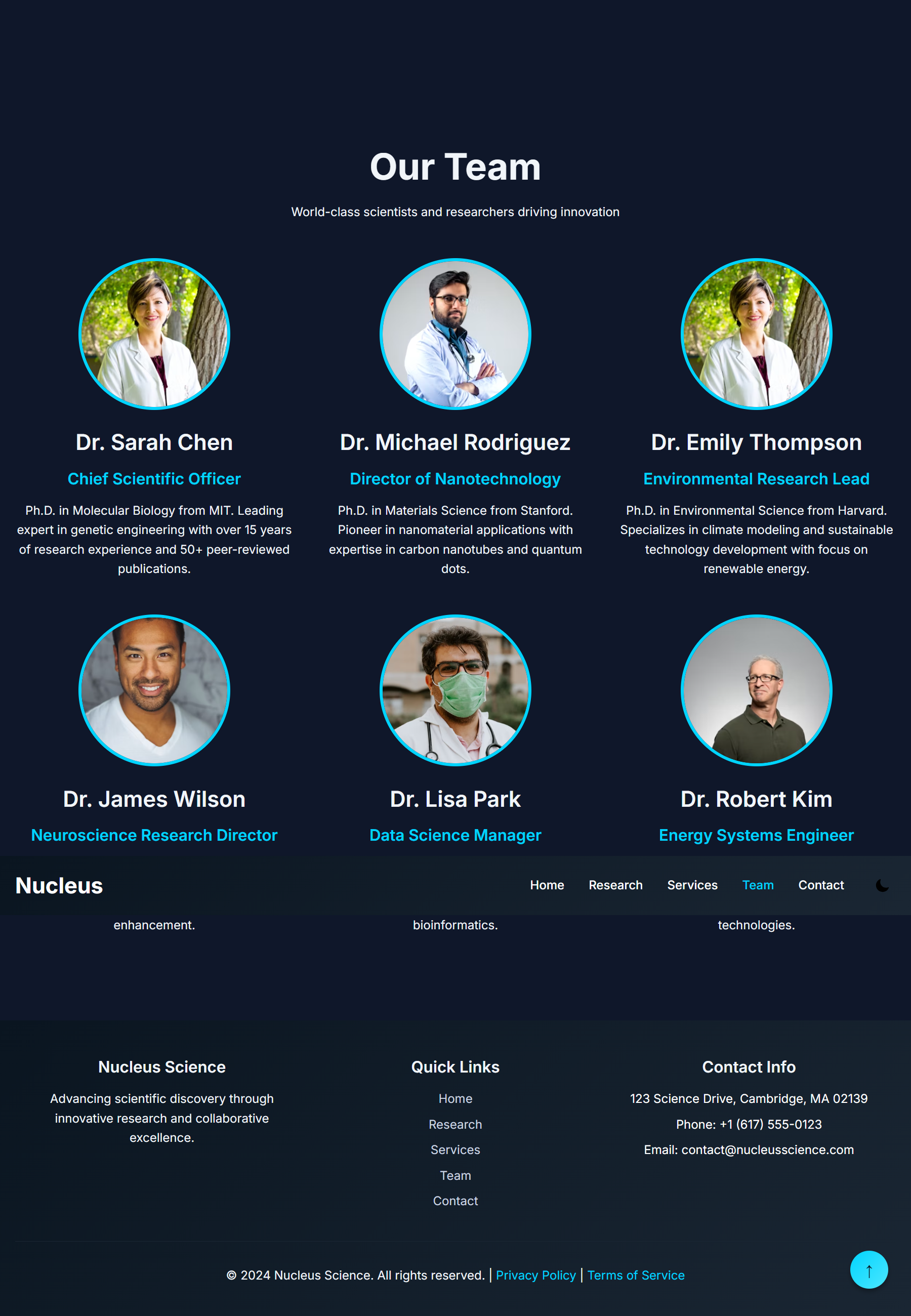 - Team Showcase - Professional scientist profiles with photos and credentials