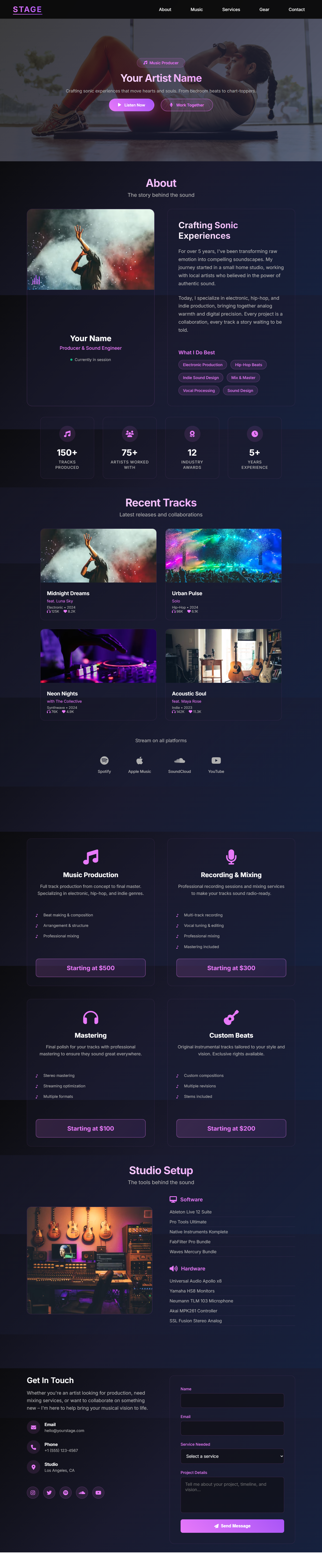 - 7 Specialized Sections - Hero, About, Music, Services, Gear, Contact, Footer